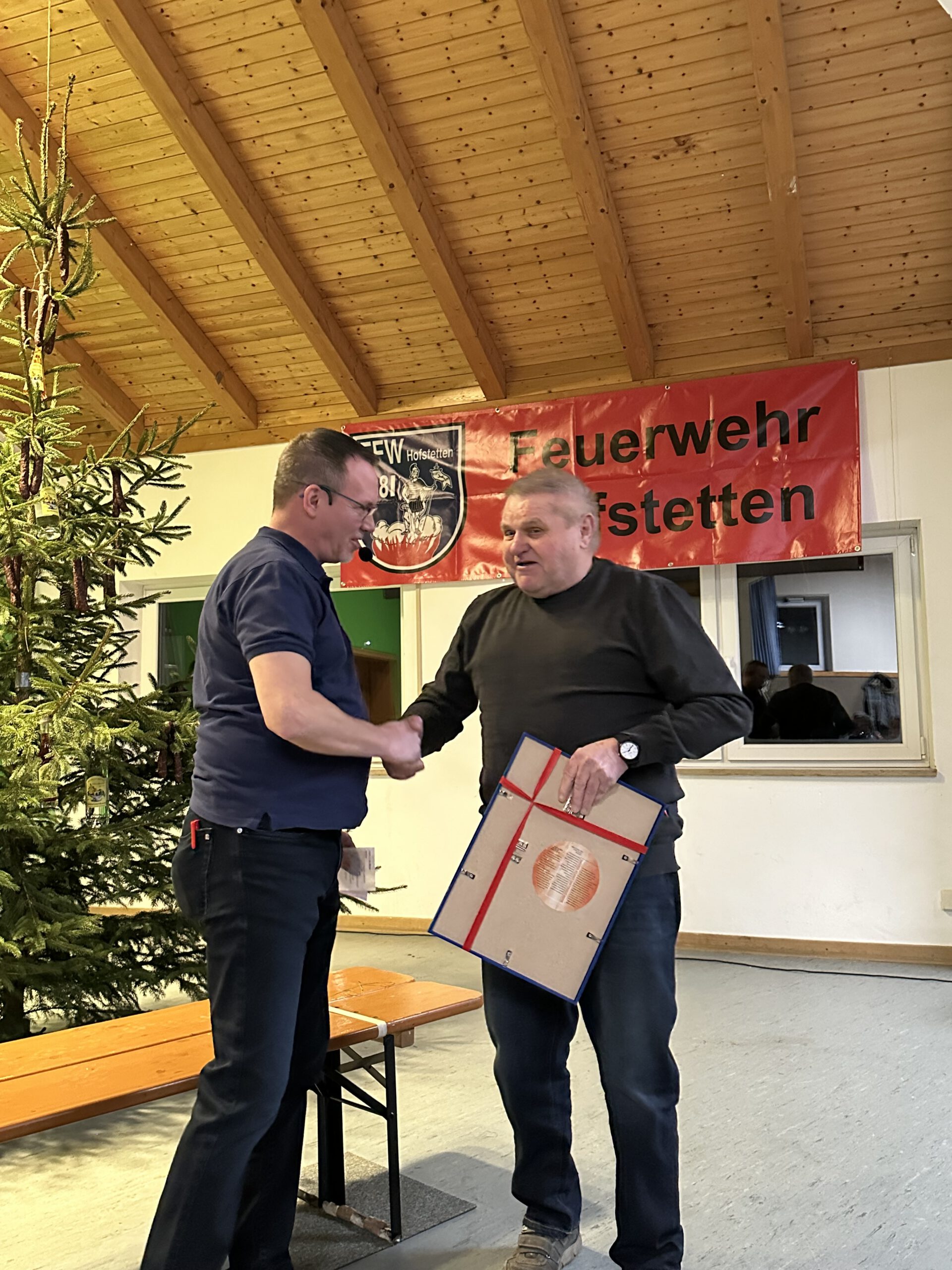 Am 05.01.2026 fand unsere jährliche Cristbaumversteigerung im Sportheim des SFH statt. Ab 19:30 Uhr gings los. Als Gäste freuten wir uns wieder neben einem sehr gut besuchten Sportheim auch über unsere Kameraden aus Laffenau, die wie in jedem Jahr wieder zahlreich gekommen sind. Nach der Begrüßung durch den 1. Vorsitzenden der FFW Hofstetten, Stefan Kraus war der erste Tagesordnungspunkt leider die Verabschiedung von unserem Metzger Michl Körner in den „Ruhestand“, zumindest was unser Schlachten angeht. Danach ging es auch schon mit der Versteigerung los. Stefan Kraus wurde beim Versteigern tatkräftig vom Ehrenvorstand Klaus Pflegel und vom Ehrenkommandanten Nobby Bräunlein unterstützt. Nach der Versteigerung der Äste ging es an Spitze, Stamm und Ständer. Abschluss des Abends war wie immer die Tombola.